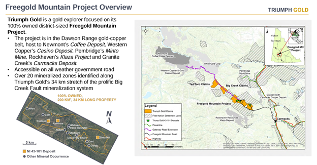 Triumph Gold is a well-positioned junior explorer with a fully owned, district-scale land package in Canada's Yukon Territory. Its flagship Freegold Mountain Project spans 34 km along the mineral-rich Big Creek Fault, home to Newmont's Coffee, Western Copper & Gold's Casino, and Rockhaven's Klaza.
