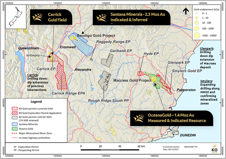 Unlike many early-stage explorers that scatter their efforts across multiple jurisdictions, KO Gold has taken a highly concentrated approach. The company controls a large land package in the Otago Gold District covering approximately 400 square km through four active exploration permits at Carrick, Hyde, Glenpark, and Smylers, all within close proximity to OceanaGold's active Macraes Gold Mine and near-term producer Santana Minerals' Bendigo-Ophir Project. In addition, KO Gold has an exploration permit application in the Carrick Range area awaiting final approval from the NZ government, located immediately south and contiguous with its Carrick permit. The Company also has a net smelter royalty (NSR) on three additional permits (Garibaldi, Raggedy Range, and Rough Ridge South) totaling 243 square km. This gives it exposure to multiple gold systems within a single, well-understood geological belt.