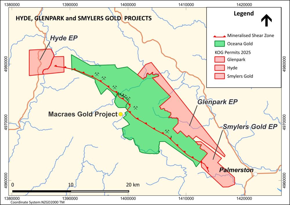 Smylers lies directly on strike from the Macraes Gold Mine along the Hyde-Macraes Shear Zone, a major gold-bearing structure extending for more than 30 km. Macraes itself was the asset that transformed OceanaGold from a junior into a mid-tier producer.