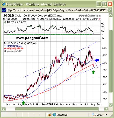 Featured is the daily gold chart. Notice the seasonal low in June, right on schedule. Next, the dip below the 200DMA earlier this week, very similar to a dip in August of 2007 (green arrows). That dip was the trigger for a move that took gold from $650 to $850 in 3 months.