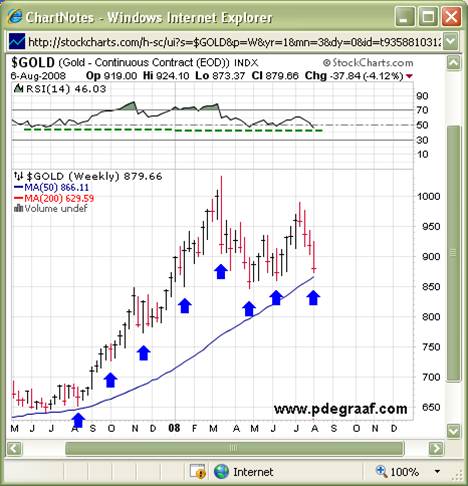 A similar move now will take the price of gold to $1,075.00, surpassing the $1,030.00 high point set in March of this year. According to market expert Joseph Granville: “In a bull market, every time price moves near or below the 200DMA, it is an opportunity to buy.”