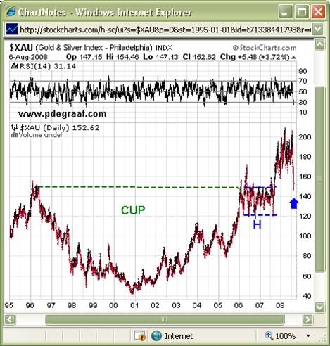 Featured is the bar chart for the XAU gold and silver stocks index. Price carved out a bullish multi-year ‘cup with handle’ formation, with the breakout occurring late 2007. Price moved up to 200, where a correction set in. This correction took on the form of a test of the breakout. That test reached the rim of the cup a few days ago, and Wednesday it rebounded by 5.48 points (blue arrow). Once the test of a breakout is completed, price usually moves back in the previous direction and on to new heights. Now is a great time to be buying gold and silver stocks again!