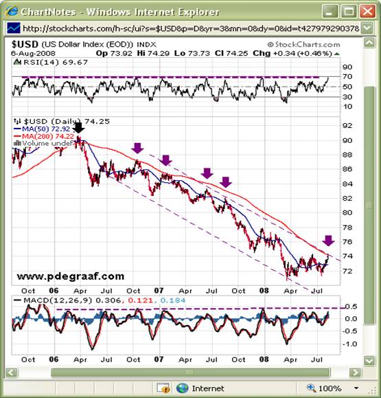 Featured is the three-year bar chart of the US dollar index. The dollar is measured against 6 currencies: Euro, C$, J. Yen, Br. Pound, Swiss Fr. and Swedish Kr. A bear market in the US dollar commenced early 2006. Since that time at least five times the US dollar has tried to overcome the down-trending resistance line, or the 200DMA, without success. Today the dollar is trying again. If it is successful in rising above the 200DMA, it will mark the beginning of a new bull market. The fact that gold and silver were able to rise Wednesday despite a stronger dollar would indicate that gold traders expect the dollar to turn back down again. To bolster that conclusion you will notice that the RSI and MACD are bumping up against resistance (purple lines). We’ll soon know the outcome. The fundamentals for the dollar are not great. Low interest rates and lots of monetary inflation, along with a ‘sick’ banking sector.