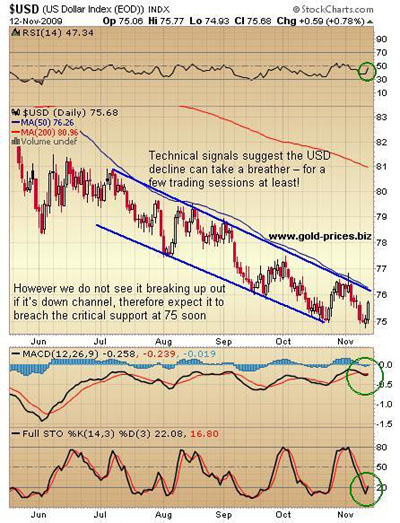 ![]() Technical signals from the RSI, STO and MACD indicators suggest that the greenback’s decline will take a breather, for the next few trading sessions at least, before falling further to break a critical support at 75. This temporary strength in the USD provides a good opportunity to get short on the greenback or get long on gold at a small discount. Taking such a position should return gains in the short and intermediate term, as well as over the long haul. The USD has key support at 75, which it will break soon causing a sharp drop which will send gold towards $1200. Note on the chart below how sharply the USD broke down through 75 before in early 2008. ![]() So if you haven't got long on gold yet, an optimum time to get long will be over the next few trading sessions. Once you have a long position, hold on tight because it's going to be a fast, knee-jerking ride and $1,200 will be upon us in no time!