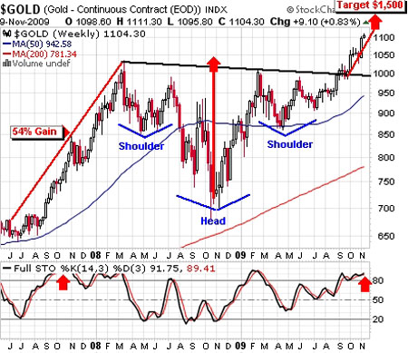 While I tend to favor fundamental analysis and never fall in love with the predictions offered by technical analysis, it is hard to deny just how textbook the recent head and shoulders pattern has developed. The anticipated breakout should take the gold price above $1,300 before consolidating and towards the target of $1,500 during 2010. It is worth noting that while the stochastics are flashing overbought, they have yet to turn down and have further to run before reaching the highs corresponding with previous peaks in the gold price (see red arrows at bottom of chart).