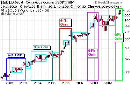 The trend seems to be towards shorter and more potent breakout periods with longer correction/consolidation periods in between. This makes perfect sense if you view the consolidation period as a "breather" or chance for the bull to rest and rebuild energy before the next major move. Consolidation periods can also be viewed as a spring that builds an increasing amount of potential energy the longer the price stabilizes. When buyers return to the market after a long period of consolidation, explosive breakouts tend to ensue. This is precisely where gold sits today, finally breaking out more than a year after hitting $1,000 for the first time.
