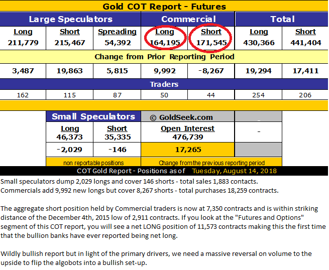 Just as I complete a thorough debunking of "all that has worked in the past," and having declared it obsolete, out comes the COT report. It is a wildly bullish report from a couple of perspectives. First, the Commercial aggregate short position is now within 5,000 contracts of the December 2015 bottom in gold at $1,045. Second, the net shorts for Large Specs (dumb money) at 215,500 contracts is 45% higher than it was at the bottom in December 2015. In a normal world, absent the criminal interventions and manipulations mentioned earlier, I would go "all in" on options on the JNUG and NUGT, and buy several hundred GLD contracts for January expiry. However, I am awaiting evidence of a short squeeze, engineered and triggered by the Commercials and agonizingly executed by the Large Specs, who stand to get annihilated if gold turns now.