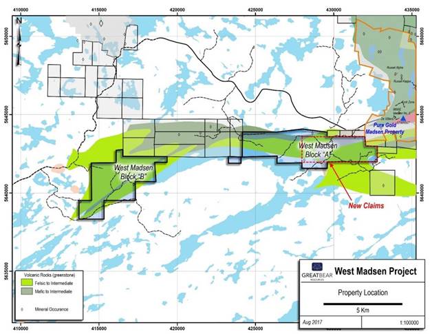 Great Bear also has two potential successes in the Red Lake Mining District with its 2,725-hectare West Madsen Project comprising West Madison A Block and West Madsen B Block as shown in the map below, which encompasses the strike extension of the geology that Pure Gold Mining (PGM.V) controls with its nearby Madsen gold discovery.