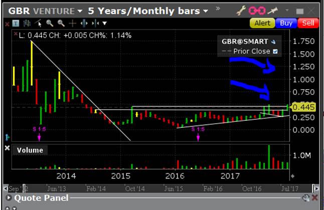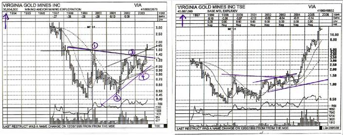 One of the benefits of age, or as I call it now, experience, is you have lived to see a few cycles, and mining has a lot of cycles, but also I remember the stock charts of precious metal companies for some strange reason, and when I looked at the break out of GBR.V, two companies popped into my head, but I thought Virginia Gold was the most similar, so I went back and looked at the charts, and then I ask myself "Does this look like that?" I say, "...err... yup. I can see that."