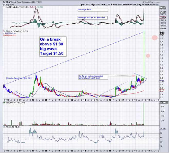 From the beginning of the year Great Bear Resources built—in technical terms—a "triangle" until it announced the drill results and its share price gapped higher, giving new investors little time to position themselves at lower prices or holders to sell at the two additional higher targets; the shares blasted through all the previous targets. Then on August 24, Rob McEwen, famed precious metal investor and CEO of McEwen Mining (MUX.TO), bought an ~18% position in Great Bear Resources, divided between himself and his company. And the shares proceeded to and exceeded my last published target.