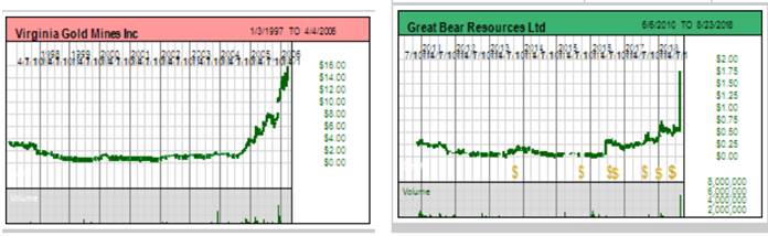 Now I realize I am getting ahead of myself comparing an exploration play like Great Bear Resources to Virginia Gold, a company that built a resource and later was bought out by Goldcorp, but the technical evidence is mounting both fundamentally and technically that Great Bear is on to something important. We can see that after Virginia broke out of its triangle it corrected back to its break point and then some, so we have to be aware of the tremendous volatility these companies can experience, but as a technical person, I also have to look at the long-term potential of such an investment and see the possibilities of the "what ifs" that are in the chart pattern. Because Great Bear broke above the last stated target of $1.80 and exceeded it, I can see the "possibility" of $4.50 in the chart, not right away, and not straight up, but it's possible when rock that was previously—only days ago—given little value, potentially becomes very valuable.