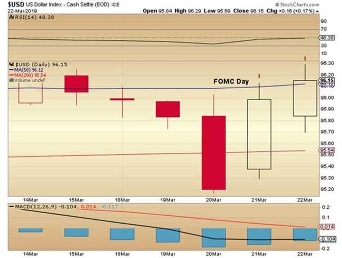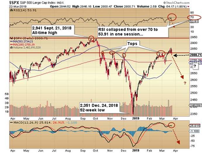 That was before Mr. Market was smacked in the face by an inverted yield curve "excuse" and a torrent of destructive economic reports out of Europe and Asia. Lest we otherwise forget that stocks have been on an intravenous tube filled with Fed adrenalin (from now on to be referred to as "Fed-renalin") complete with stock-friendly bulletins, interviews, press conferences and, of course, appearances before Congress designed to bolster the wealth-effect impact of rising global stock exchanges. The net result going into Friday was an absurdly overbought market screaming higher in the face of a weakening macro environment, as bond yields have been flashing for some time now with the S&P losing 54.17 points and settling DOWN on the post-quadruple-witching week. The streak continues.