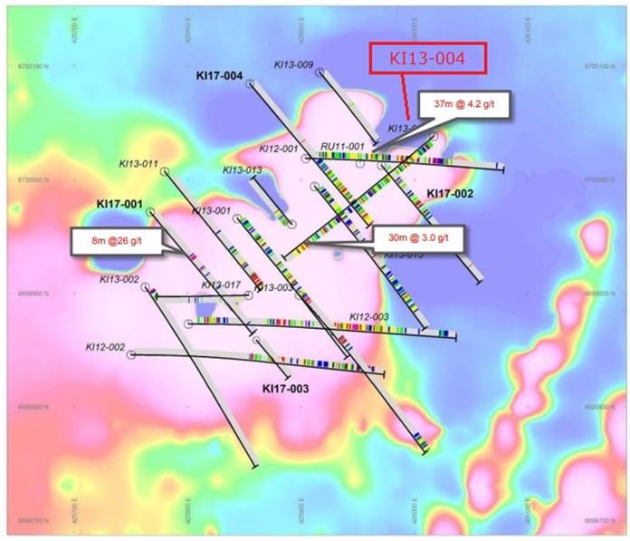 - 64m @ 1.46 g/t Au from 35m, including 14m @ 3.12 g/t Au from 37m, and 10m @ 6.51 g/t Au from 248m in DDH KI17-005