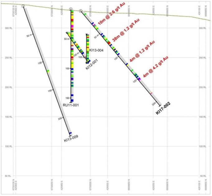 - 38m @ 1.16 g/t Au from 58m, including 8m @ 3.98 g/t Au from 68m, in DDH KI17-002
