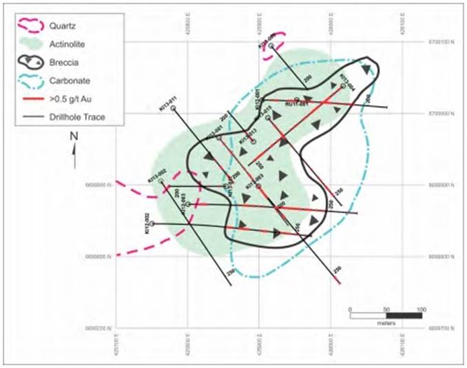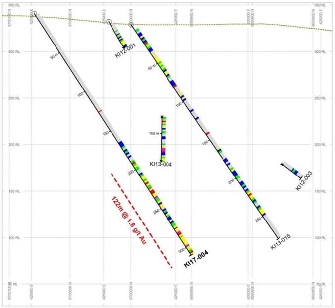 - 122m @ 1.82 g/t Au from 188m, including 15m @ 3.34 g/t Au from 294m, in DDH KI17-004