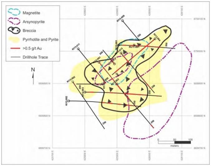 Figure 60 – Conceptual cartoon, based on core logging information, of the Rusty Zone outlining magnetite and sulphide zonation with respect to gold values. Arsenopyrite is found in the core of the gold zone but primarily on the outer edge of gold mineralization and out into the magnetic low to the east of the Rusty Zone. The breccia zone encompasses a majority of gold intersections. Magnetite makes of the core of the zone with a sulphide halo extending around the magnetite core.