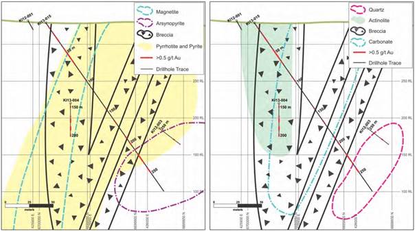 Figure 62 – Cross sections showing mineralization and alteration zonation in the Rusty Zone with respect to gold grades above 0.5 g/t Au. Breccia zones are important for gold mineralization and show a strong correlation in this cross section. The sulphide halo surrounding the magnetite core can be seen. Gold occurs in both the magnetite and sulphide zones. Arsenopyrite is often found in the magnetic low to the east of the main Rusty zone. Gold is intersected in these zones rich in arsenopyrite. However, grades are commonly below 0.5 g/t Au. Actinolite and carbonate alteration make up the primary alteration minerals seen in gold zones. Carbonate (calcite and dolomite) does have a broader alteration halo as shown in the cross-section. Quartz alteration is seen distal to the main breccia bodies and gold zones.