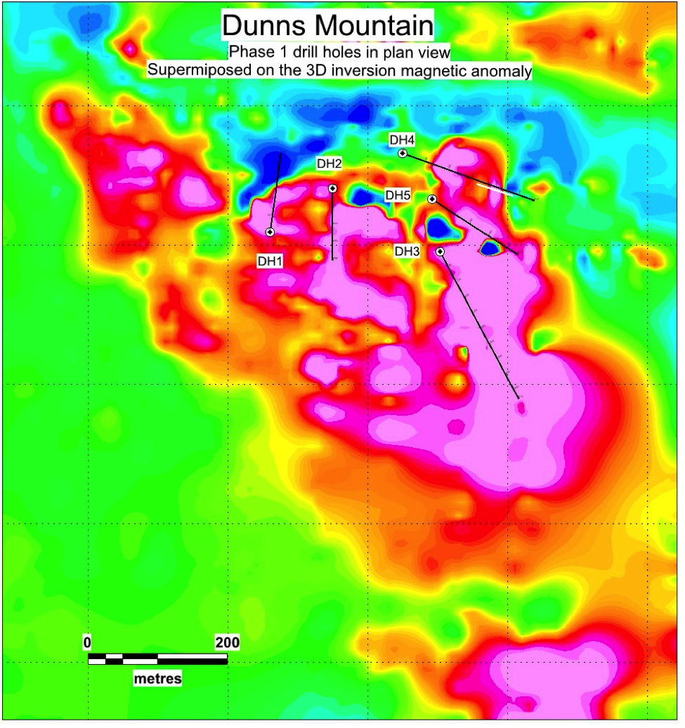 The press release also stated: "In preparation for phase 2 drilling at Dunns Mountain, additional geophysics will be carried out including ground magnetics, Induced Polarization (IP) and a gravity survey to first define the area to be tested around drill hole CH-19-004 and secondly aim to identify additional targets along the periphery of the magnetic anomaly. These surveys will also cover the anomalies 2.5 km to the south in the Carols Hat target area. In addition, the Company will complete a deep penetrating IP and gravity surveys, over the K6 target in preparation for phase II drilling. The K6 target sits 12 kilometres south of Dunns Mountain."