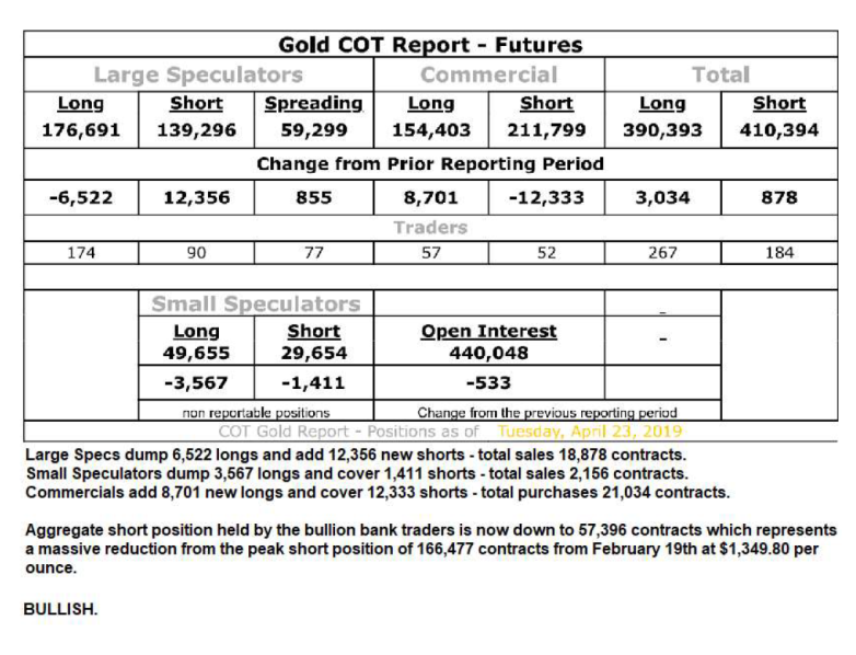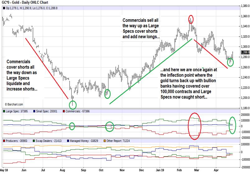 In the "You have GOT to be joking" category, once again, thanks to the blind eye of the regulators and the criminal complicity of the CFTC, the bullion bank traders manipulated the gold market through coordinated Crimex opening bombings to create a pervasive aura of fear and loathing such that the $1,282 level was taken out with a vengeance on April 16th with the $1,267.90 lows coming exactly one week later and precisely at the conclusion of the April 23rd COT week. You read it here late that week when I concluded that the $1,282 "breakdown" would be a sucker shot (failed breakdown), which resulted in last Saturday's missive. By that Tuesday, every algobot and armchair technician was targeting and typing "200-day moving average @ $1,252" but as we now look back, the bullion bank Cretins created the signal through intervention and then with the "breakdown" pattern in place, ambushed the Large and Small Spec sellers/shorters by engaging in massive short covering, which halted the descent and set up the late-week rally—and the COT Report spells it out by their actions right up to the day I went 100% long. See below…