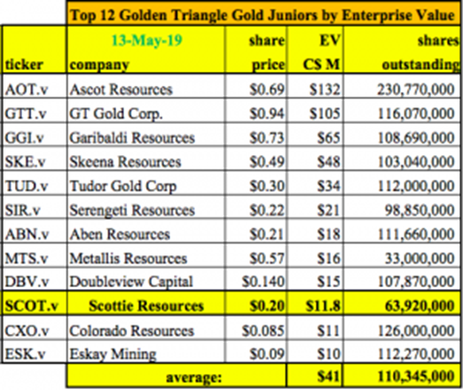 Brad Rourke: Any existing shareholder of Scottie Resources (TSX-V: SCOT) who knew the story before last month's news should be thrilled with this latest development. If you liked it at 20c or 25c, with our tight float, you should love it now! We have a $12 million (C$0.20/share on May 13th) market cap, and our closest meaningful neighbors, both of whom we share borders with, have market caps of $160 million (Ascot Resources) & $2.0 billion (Pretium Resources).