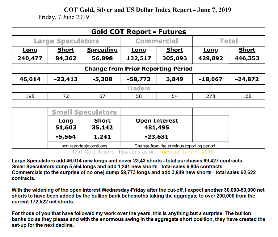 We have all seen this movie before, and while it is both maddening and infuriating, it in no way alters my longer-term bullishness on gold and silver. What this does illustrate is just how corrupt the Comex ("Crimex") has become and how important it is that you turn off CNBC and ignore the table-pounding gold bugs that would have us leveraging up at precisely the wrong time (like last Thursday/Friday), with RSI (relative strength index) readings in the mid-to-high 70s and the investment conference rock stars all feverishly tweeting out targets of $1,400-plus by July 4. When the bullion banks are sellers, you do not want to be long. Period.