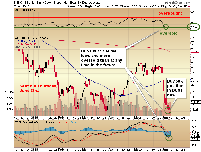I will be adding to shorts on Monday, on any type of bounce in both the GLD and the miner ETFs. The DUST was bought at the $16.47 and $15.90 for an average of $16.18 and will probably open in the low $17s on Monday.