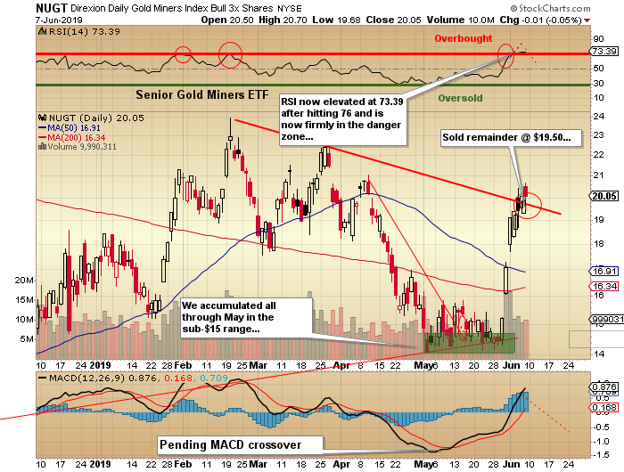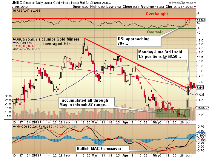 Gold miner ETFs (NUGT/JNUG) were both wildly overbought by last Friday, and while I was in awe of the impact of the buying, I added to the DUST and GLD July $125 put positions late week (confirmed by multiple tweets when action was taken), and now remain comfortably short with gold down $15 going into the Monday opening.