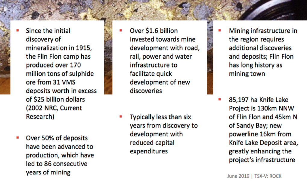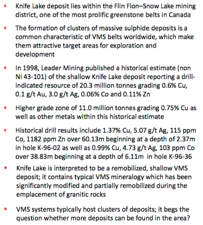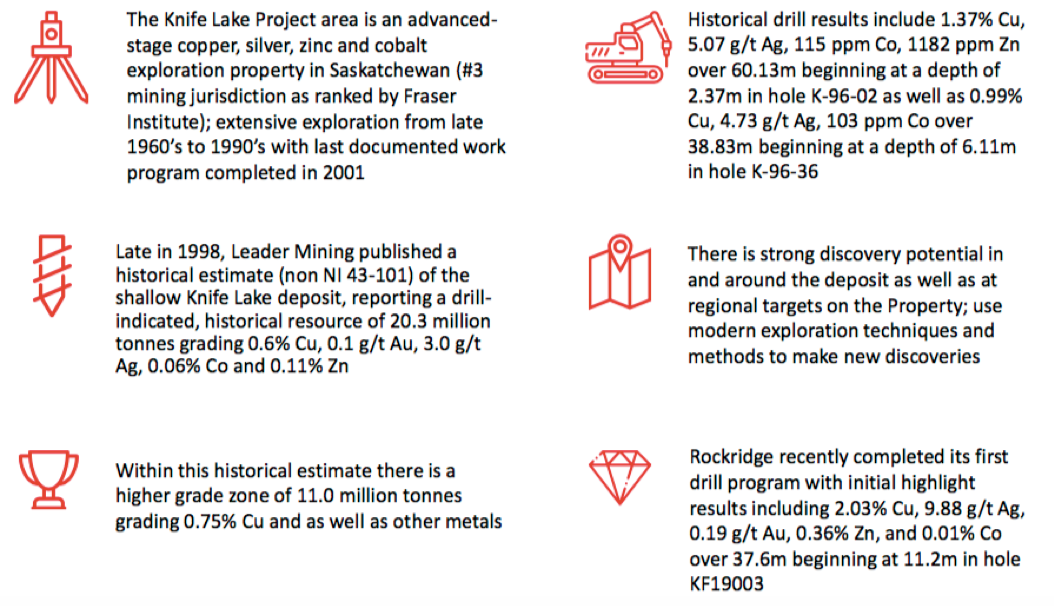The company's flagship project, Knife Lake, is in Saskatchewan, Canada (ranked the third best mining jurisdiction in the world), in the Fraser Institute Mining Company Survey. The project hosts a near-surface, (high-grade copper) VMS (volcanogenic massive sulphide) copper-zinc-silver-gold-cobalt deposit, open along strike and at depth. Management believes that there's strong discovery potential in and around the deposit area, and at additional targets on roughly 85,200 hectares of contiguous claims. As a reminder, Rockridge has an option agreement with Eagle Plains Resources to acquire a 100% interest in the majority of the Knife Lake VMS deposit.