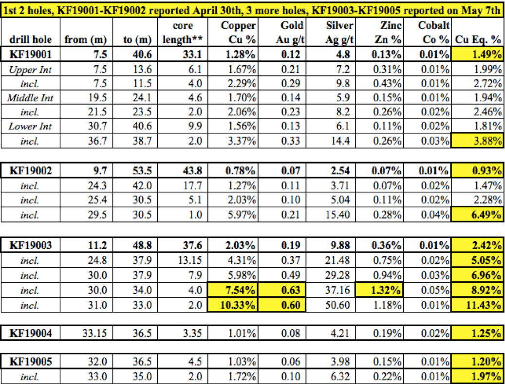 Last month Rockridge reported additional results from its winter diamond drill program. The first five holes are shown in the chart above. Readers may recall that a key takeaway was that holes KF19001 and KF19002 largely confirmed historical grades, intercept widths and geological conditions. Hole KF19003, reported on May 7, was a blockbuster—37.6m of 2.42% copper equivalent (Cu eq.), significantly better than the first two holes. KF19003 had a grade (Cu eq.) x thickness (in meters) value of 91, compared to 41 and 49. Importantly, it confirmed high-grade mineralization up-dip of KF19002 in an area where no historical drilling is known to have been done. Therefore, this assay, and perhaps nearby assays to follow, could potentially increase the size and grade of the upcoming mineral resource estimate.
