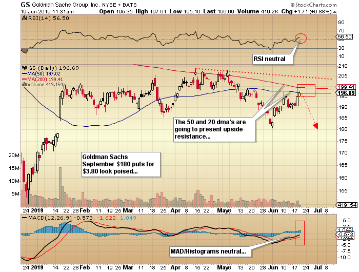 Ergo, the Goldman Sachs Sept. $180 puts for $3.80 appear to be ripe for accumulation. I have also put on a modest position in the SPY July $280 puts at $1.63 earlier. Remember that you should never go overboard, either bearish or bullish, going into the FOMC, and always keep a bunch of cash available in the event there are surprises.
