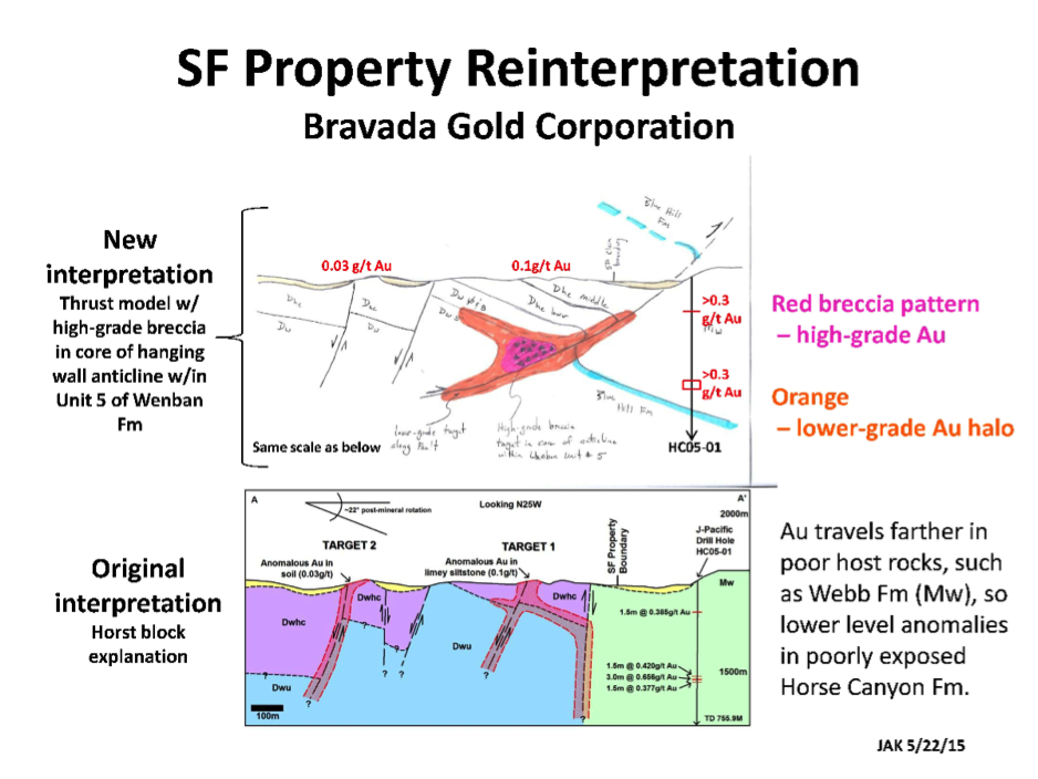 According to Bravada Gold: "Recently published data on Nevada stratigraphy and structure has led to a reinterpretation of stratigraphy and structure at SF, greatly upgrading an untested target."