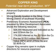 Edward Karr: We formed U.S. Gold Corp. as a private company back in 2014. The reason we founded U.S. Gold Corp. really was to acquire our flagship property called Copper King. Copper King is located in the state of Wyoming about 20 miles outside of Cheyenne. It has a very robust resource. It is an open pit gold, copper, silver, zinc, polymetallic porphyry deposit, and comes right up to surface. We bought Copper King off another publicly traded company called Energy Fuels Corporation. Energy Fuels is a uranium company based out of Denver. They had acquired Copper King when they took over Strathmore Minerals Corporation, and it was a non-core asset for them being a gold/copper deposit. That's how we originally set up and formed U.S. Gold Corp.