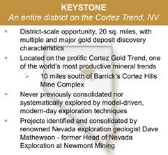 Edward Karr: We had an opportunity come along while were still private and only had our flagship project Copper King. In 2016, I received a telephone call from Dave Mathewson, the well-known Nevada exploration geologist, and he had a new exploration project called Keystone. Dave told me that he believes Keystone is the best exploration project he has seen in his career. It has an incredible address being located in Nevada on the Cortez Gold Trend. It's about 12 miles south of Barrick Gold's Cortez Hills complex, which includes the Cortez Hills Mine, the new discoveries, Gold Rush, ET Blue and Fourmile. We are right below that and it looks very prospective. When Dave told me about it, I just knew we had to do a deal, so we acquired Keystone into U.S. Gold Corp.