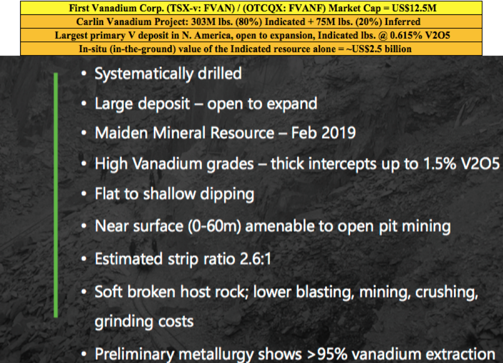 That, plus positive metallurgical test work and environmental baseline studies to advance permitting. If one is bullish on the vanadium price, currently at US$8.20/lb., then First Vanadium's project in the first-of-84-ranked global jurisdiction of Nevada should be high on the list of projects to consider investing in.