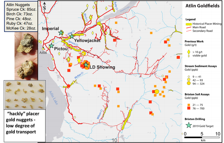 The Atlin project is particularly interesting because of its very rich history: Data indicate placer mining has been ongoing for in excess of a century, and some of Canada's largest gold nuggets were actually discovered in this camp. In fact, the largest nugget ever found on Canadian soil weighed 85 ounces and was found here, in the Atlin gold camp. This provides plenty of reason for an exploration company to have a closer look at Atlin as modern exploration techniques could help Brixton to target the feeder zones. After all, the gold nuggets and placer gold had to come from somewhere.