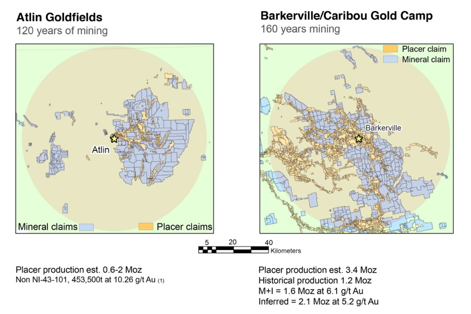 Brixton Metals compares its Atlin gold camp with the Barkerville/Caribou gold camp, also in British Columbia. Some companies use comparable projects/districts that could considered to be a stretch, but we feel Brixton's comparison does make sense. In both districts there has been a rich history of in excess of 100 years of placer mining with a cumulative gold production of millions of ounces of gold. The total production at Barkerville/Caribou (3.4 million ounces from placer activities and 1.2 million ounces from historical mining activities) is better documented than the total gold production at Atlin, but based on historical data and documents, Brixton estimates the Atlin gold camp was responsible for up to 2 million ounces recovered from placer operations.
