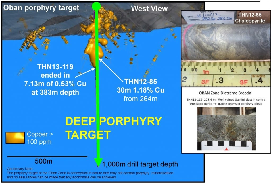 But the company's exploration season will be kicked off by one deep drill hole at Thorn, where it plans to follow up on a thick layer of copper mineralization that had been identified during previous exploration campaigns.
