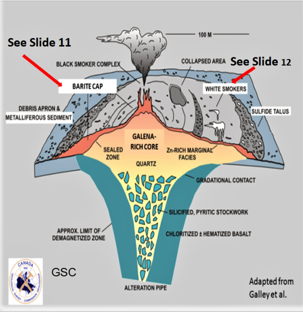 The geological model is called a black smoker. Black smokers are underwater hydrothermal vents that emit jets of particle-laden fluids. The particles are predominantly very fine-grained sulfide minerals formed when the hot hydrothermal fluids mix with near-freezing seawater. These minerals solidify as they cool, forming chimney-like structures. These black smoker complexes can host rich concentrations of copper, zinc, lead, silver and gold.