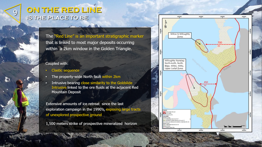 The main objectives of the 2020 exploration program at the Willoughby gold-silver property has been to improve continuity of high-grade and to test broad zones of disseminated gold and silver mineralization encountered in previous drilling and surface sampling. Surface exploration commenced on July 29, 2020 and drilling began on August 10, 2020. The Property is located on the east side of the Cambria Icefield, seven kilometers east the advanced-stage Red Mountain Gold Deposit owned by Ascot Resources.