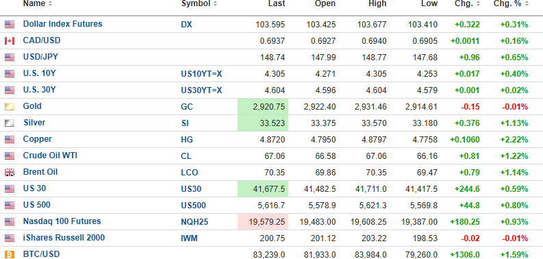 U.S. Dollar Index futures are up 0.31% to 103.595, while the 10-year bond yield is up 0.40% to 4.305%, and the 30-year bond yield is up 0.02$ to 4.604%.