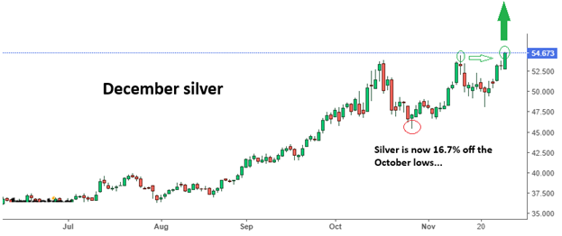 If there was one asset that exhibited Secretariat-style performance for the month of November, it was a blistering thoroughbred called "December silver." Just as Secretariat broke records in all three legs of the Triple Crown event, silver exploded out of the gate and traded well up and through the old high of $54.415, closing up 6.55% for the session and at the highest monthly close ever.