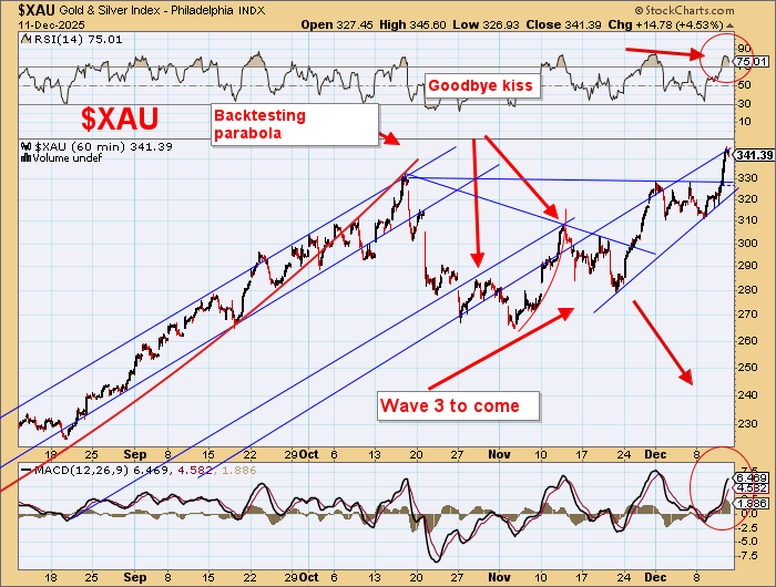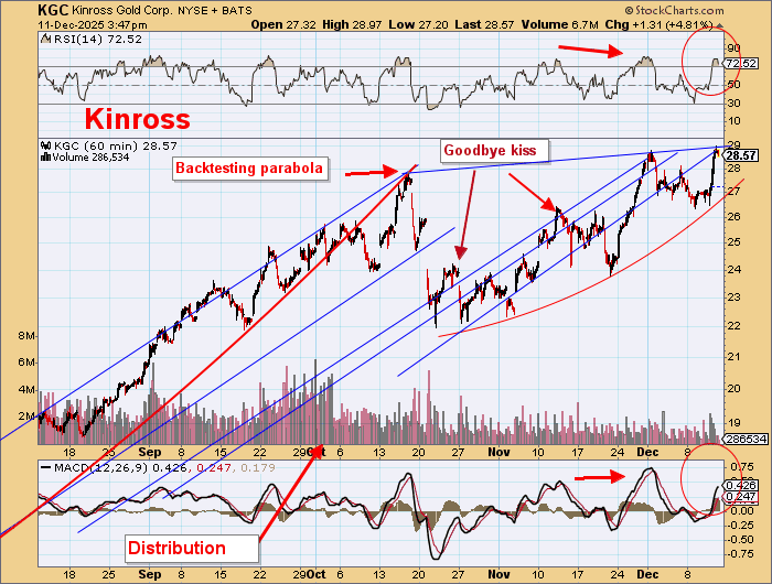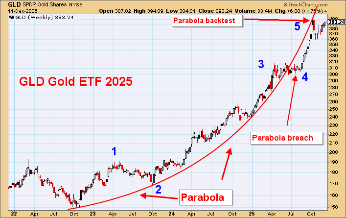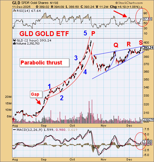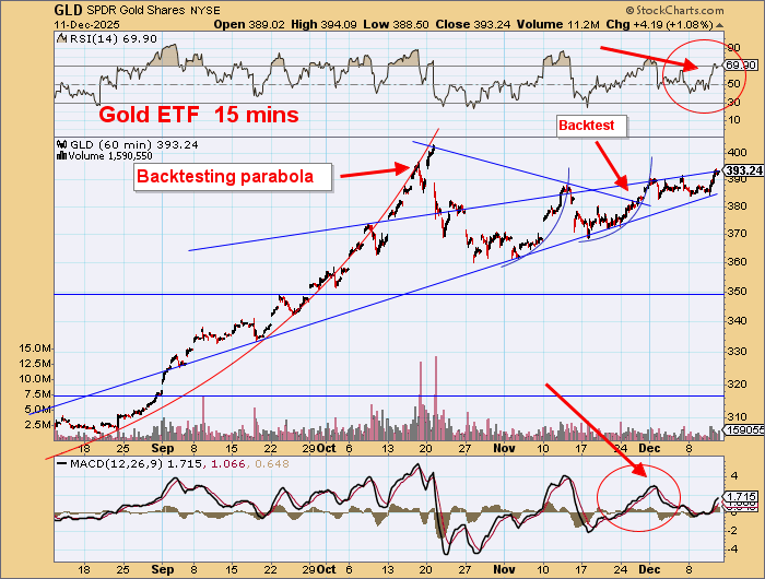 Note that it is 8 weeks since the October 20 high. Gold has rising highs but in upsloping wedges and with no strong volume.