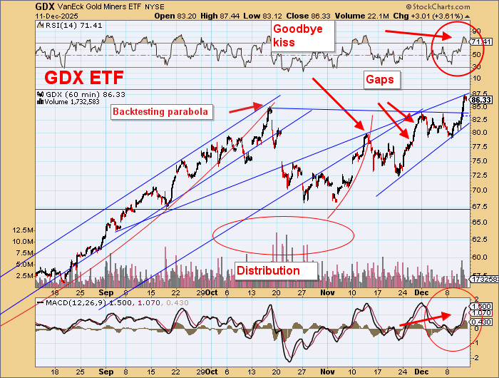 Gold surged but closed off the highs. It is overbought, and still those upsloping wedges remain.