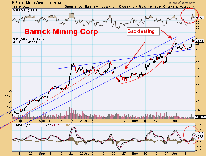 Barrick Mining Corp. (ABX:TSX; B:NYSE) has new highs, but is very overbought.