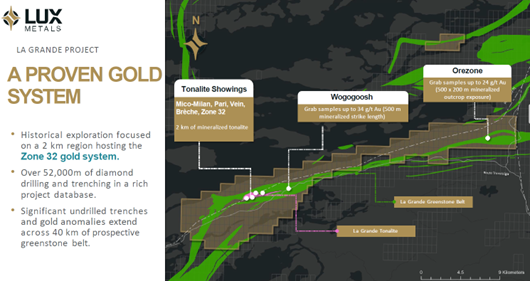 The company's flagship asset is the La Grande Gold Project in James Bay, Quebec, complemented by the earlier-stage Lux Lake Project in Saskatchewan.