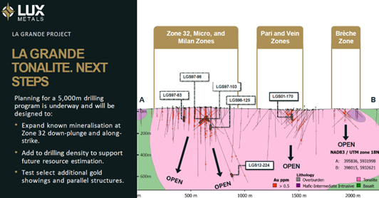 The standout feature of the project is Zone 32, a high-grade, intrusion- and shear-hosted gold zone developed within the La Grande tonalite. Zone 32 has been drilled over approximately 600 meters of strike and to depths exceeding 350 meters and remains open in all directions.