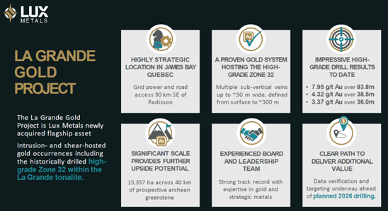 That may be what is beginning to unfold at Lux Metals Corp (LXM:TSXV; BBBMF:OTCMKTS), a junior gold exploration company that has recently repositioned itself around a high-grade gold system in Quebec's James Bay region. Formerly known as Huntsman Exploration, the company has completed a corporate reset and is now centered on its newly acquired La Grande Gold Project, an asset with real scale, excellent infrastructure, and an extensive high-grade drill database.