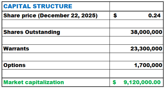 As of mid-November, Lux Metals had approximately 38.5 million shares outstanding, with an additional 23.3 million warrants and 1.7 million options. At a recent share price near CA$0.24, the company's market capitalization was approximately CA$9 million.