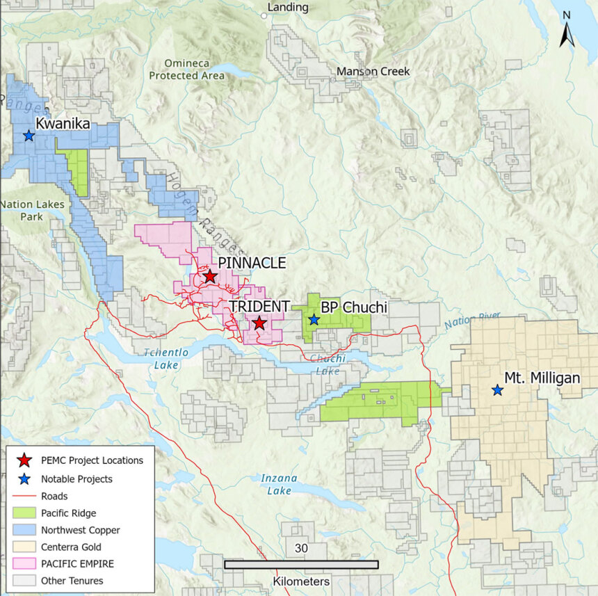 Pacific Empire's Trident and Pinnacle copper/gold properties nestle just over 30 KM NW of the Mt. Milligan Copper mine in Northern BC. In 2024, Mt Milligan yielded 168,000 ounces of gold and 54 million pounds of copper.
