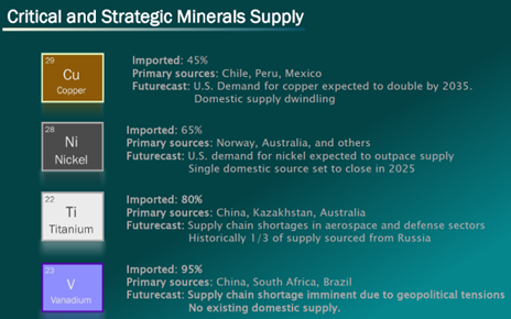 As outlined in the December 2025 corporate presentation, the company's portfolio includes five critical mineral projects, three of which already host mineral resources. The primary focus is on copper and nickel, with additional exposure to titanium and vanadium, metals that are increasingly classified as strategic due to supply chain constraints and limited domestic production in North America.